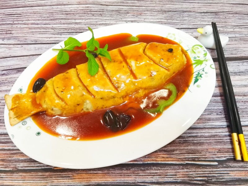 11:把过滤出来的汤汁加入准备好的调料汁煮至浓稠,最后将浓稠的卤汁均匀的浇在“黄鱼”身上即可。