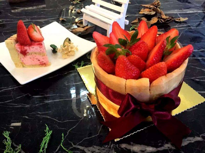 13:最后加一层慕斯,铺上草莓,再用缎带装饰一下即可。