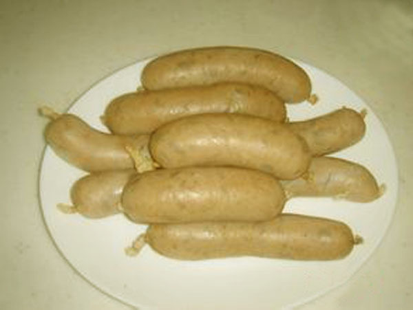 6:烤肠处理一下,放入碗里和剩余的油,烧烤蘸料拌匀。