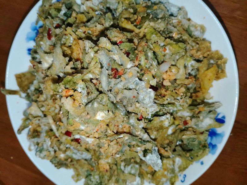3:面粉可以少量多次加入,边加边搅拌,直到芹菜叶上全都裹上了面粉。