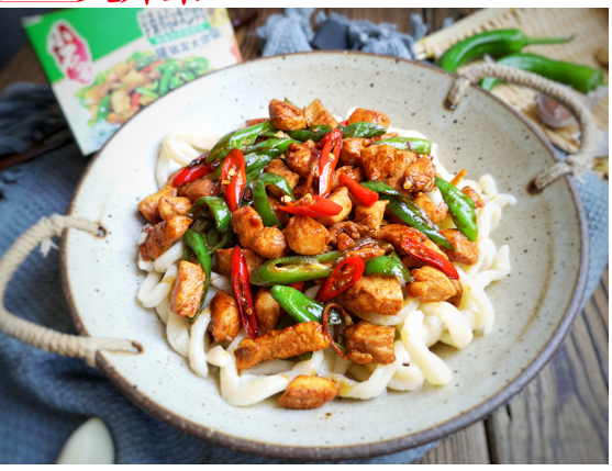 2:所需食材:普通面粉500克,鸡胸肉1块,姜2片,蒜2瓣,青椒3个,小米辣3个,十三香粉3克,盐5克,辣椒炒肉调味料75克,食用油适量,料酒15克。