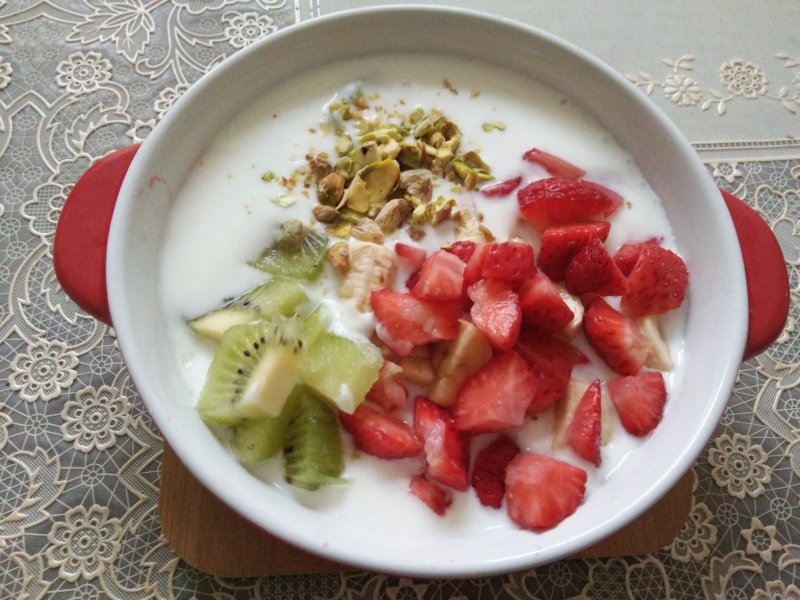 3:把切好的水果放在自己喜欢的容器里。浇上酸奶即可。