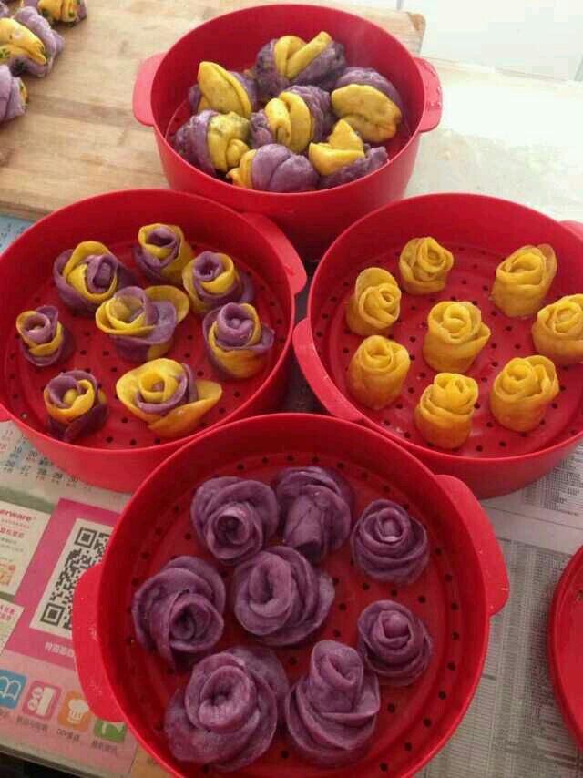 1:发面的照片没有拍,在此说明一下,紫薯蒸熟捻碎,玫瑰馒头做法:1,南瓜和紫薯分别蒸熟,去皮碾碎成泥状。2,取适量面粉和发酵粉,分别和紫薯泥南瓜泥一起揉匀,发酵1-2个小时(加些白糖会发酵的更好,将发酵好的两种面切成5个小剂子,幹成饺子皮状