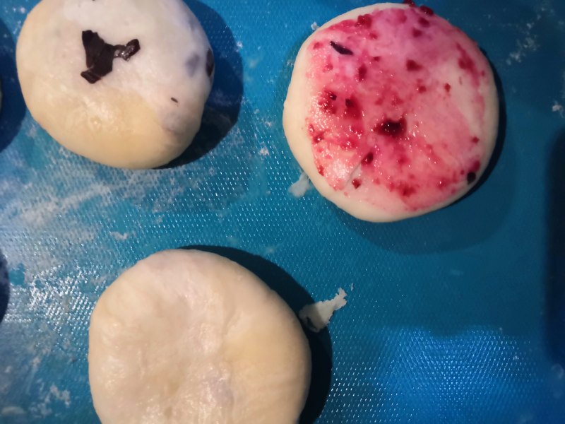 10:包入馅料后擀开。我上面用了点山楂酱,主要是为了区分馅料。只做一种的话可以不用点缀