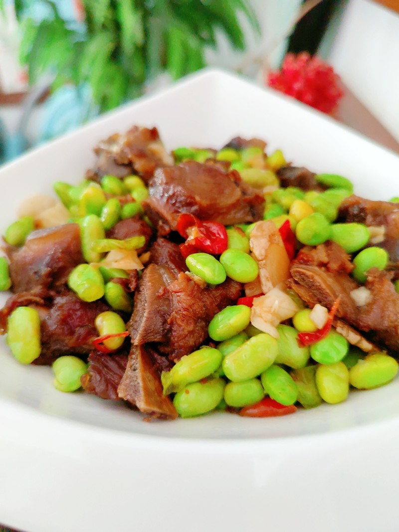 3:毛豆倒入锅内翻炒片刻后加入千张结,然后加入水或焯排骨的汤,收汁,撒上香葱