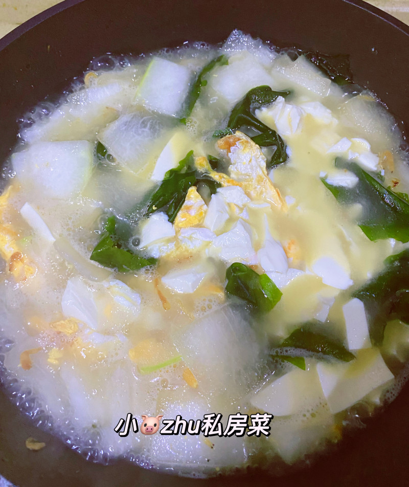 7:水开后放入裙带菜、鸡蛋、豆腐,最后加入盐和胡椒调味即可!非常清爽的一款汤。