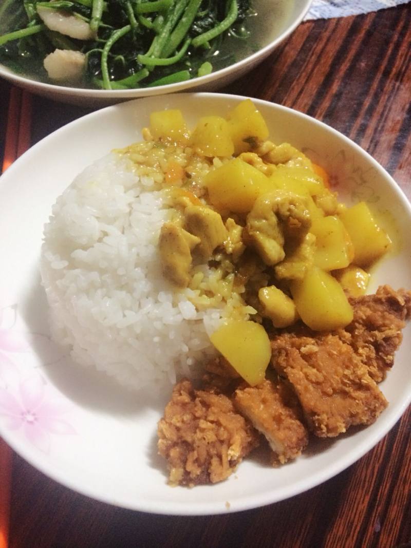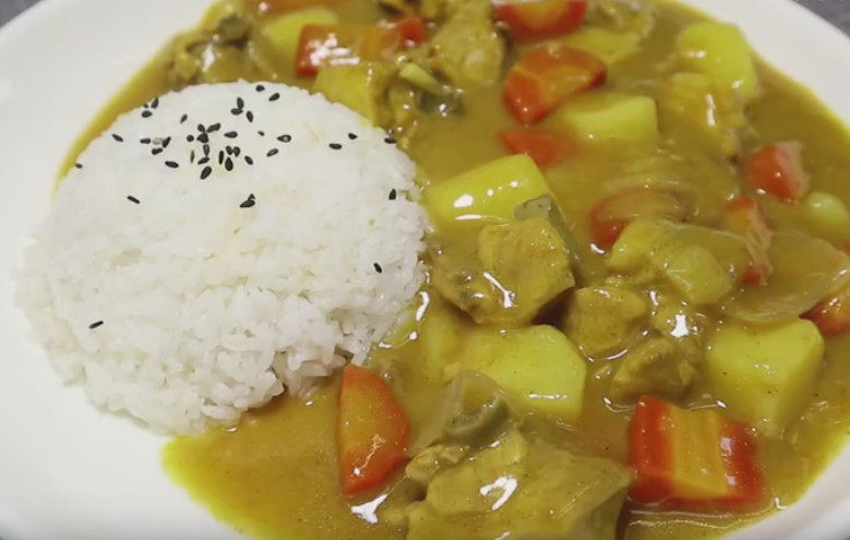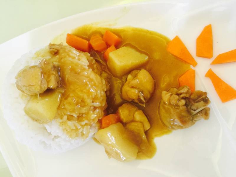 1:1、鸡胸肉洗净后切块,加入料酒、葱姜丝腌一下2、胡萝卜、土豆、洋葱切丁3、国内倒适量油,油热后加入洋葱翻炒出味,加入胡萝卜和土豆翻炒,至颜色微变,盛出备用4、加入油,油热后倒入鸡肉,翻炒至颜色变白,再倒入刚才的胡萝卜、土豆、洋葱翻炒,翻炒至变色5、加入水,刚好没过食材,盖上锅盖大火熬至沸腾后,转中火熬制10分钟6、转小火或关火加入四块咖喱,直至咖喱融化,再小火熬5分钟。若太稀,可以多熬几分钟,若稠了可以加水
