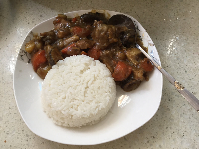 10:浇上炖好的咖喱鸡块即可,舀些汤汁更美味