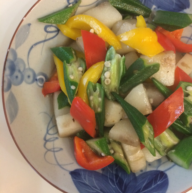 6:在炒锅里倒入色拉油,加热后先放进彩椒和秋葵,翻炒。