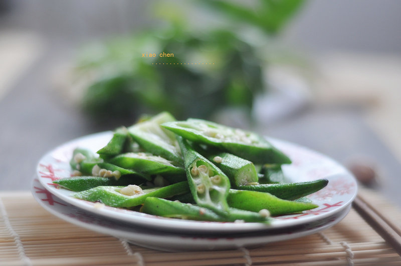 3:炒锅加少许油,将红辣椒爆香,放入秋葵片迅速翻炒,待成熟时烹入酱油适量。