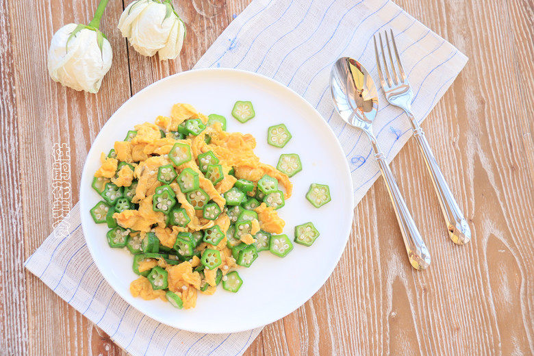 4:锅内烧油,油热放入葱花爆香,放入鸡蛋,炒至成型放入秋葵,放入准备好的调料水,翻炒一会出锅。