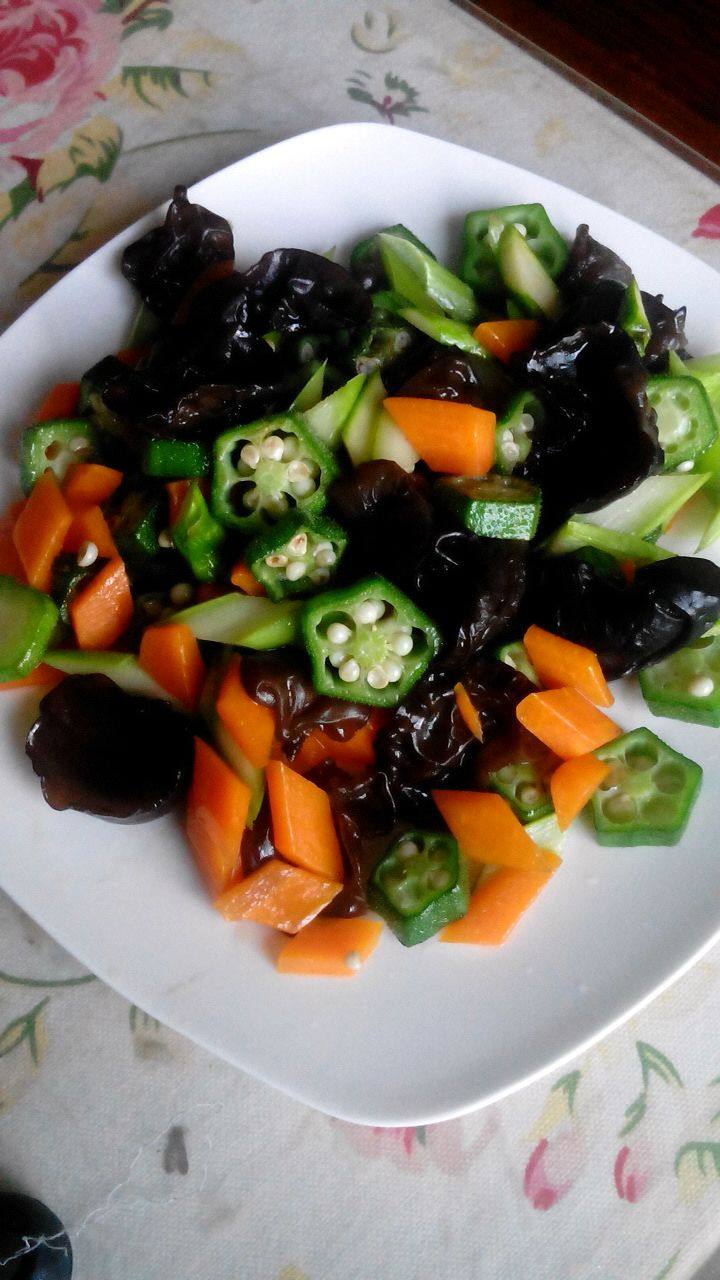 6:红萝卜过下热水,让其断生,先炒红萝卜和云耳,再下入秋葵和芦笋炒至六成熟,临出锅前加入适量盐和淀粉勾欠