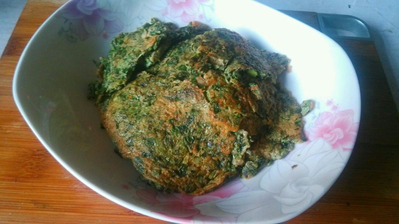 5:热锅热油,舀一勺拌好的糊糊,用勺子按成饼。等一面煎好再翻面煎另一面,花色焦黄即可。
