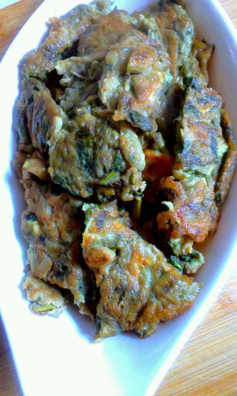 8:我这个没翻好,有点碎了,想煎成圆形的亲们,可以用一个大盘子盖在上面,在翻过来,然后从盘子里滑进锅里,再次煎至。