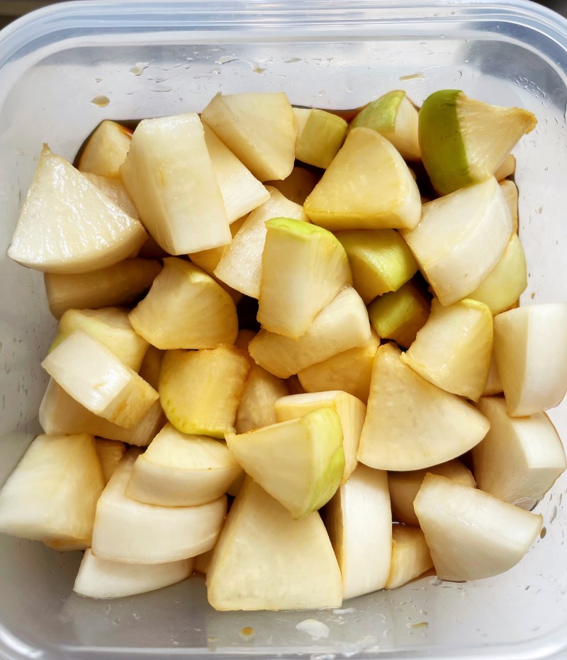 3:切好的萝卜片中加入1勺盐,腌制30分钟左右,腌出水分