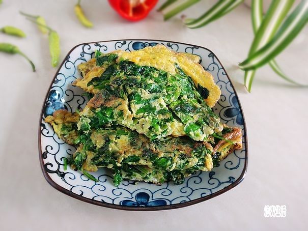 6:趁蛋液没有凝固时放入切好的豌豆尖,待蛋液凝固后翻过来煎熟另一面即可。