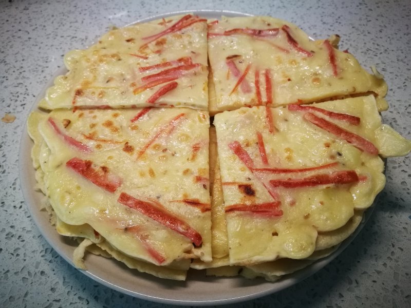 3:小火,翻面,因为很薄,所以基本有了铬渣就熟了。一开始做的葱花摊饼,不够吃的,又重新和面做了火腿胡萝卜摊饼,因为是现混的面汤,所以很容易碎,不上图啦。哈哈