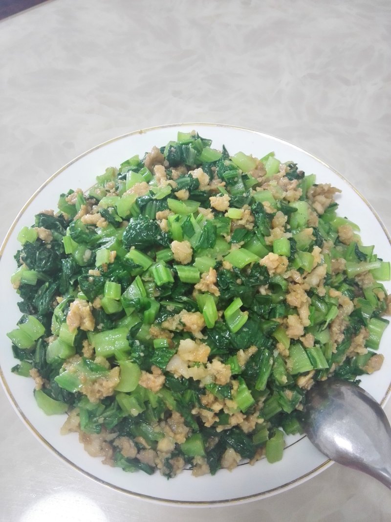 6:舀一些肉起来(因为做煎饼需要用到熟的肉末,也可以用来做拌面,所以就做多一些),把芥菜放进去翻炒。