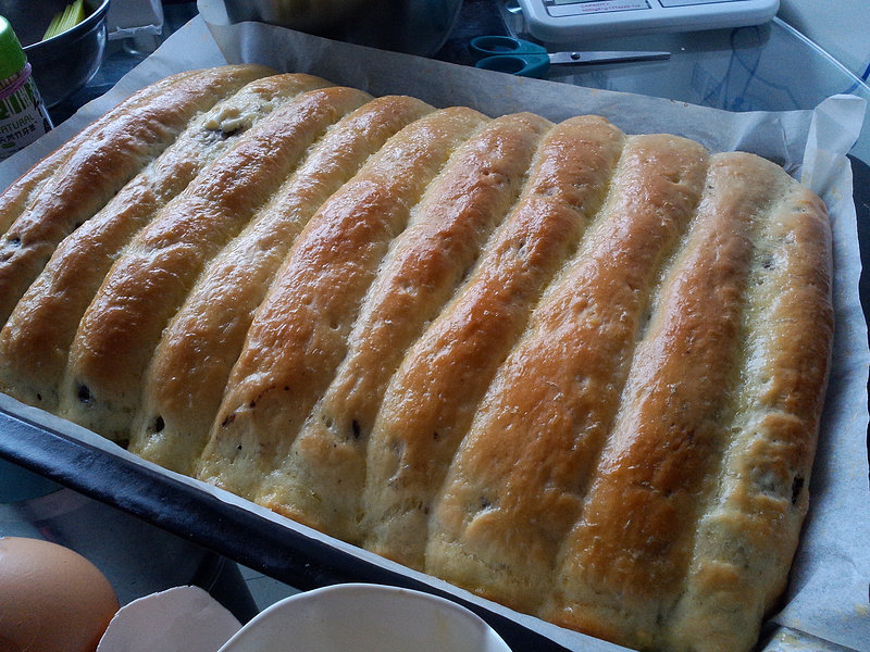 1:将所有液体混合,搅拌均匀,在倒入分类拌匀,揉至面筋扩展,加入黄油继续揉
