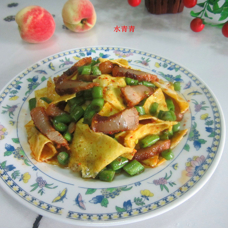 四季豆适量;蛋皮适量;腊肉适量;