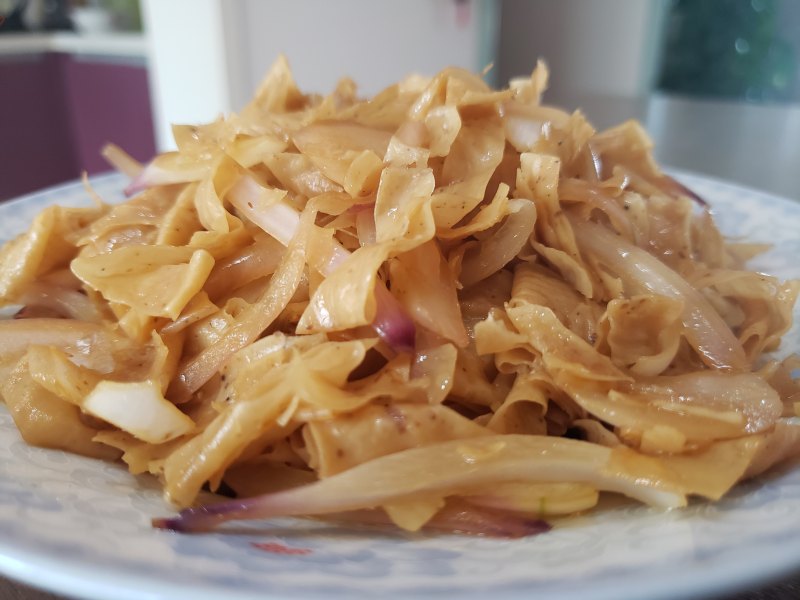 2:大火热油,先放洋葱丝在放千张丝,千张容易粘锅。翻炒至洋葱软豆腐丝焦黄。
