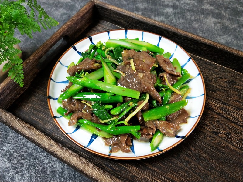 3:热锅凉油爆香蒜蓉,放入已经洗干净的芥蓝,炒到断生,装盘;再加入适量油,放入牛肉快速煸炒,这个时候一定要快速的翻炒!!牛肉由深红色变成如我图片上的颜色,就表示熟了,装在之前盘子的芥蓝上就可以了,多余的油脂会满满渗透到芥蓝上,这样菜特别好吃。