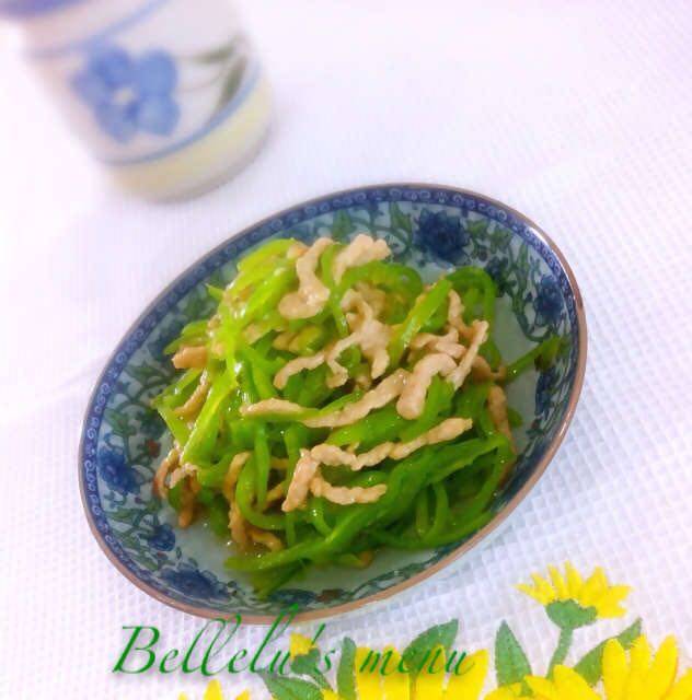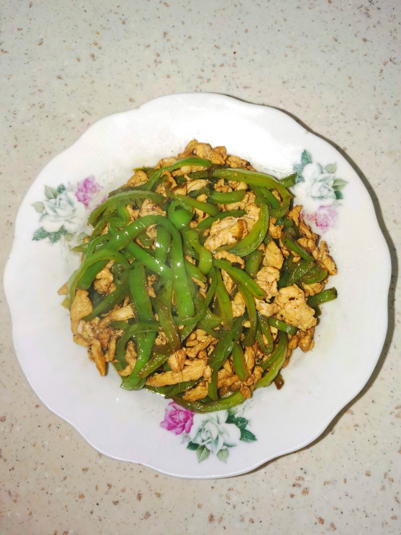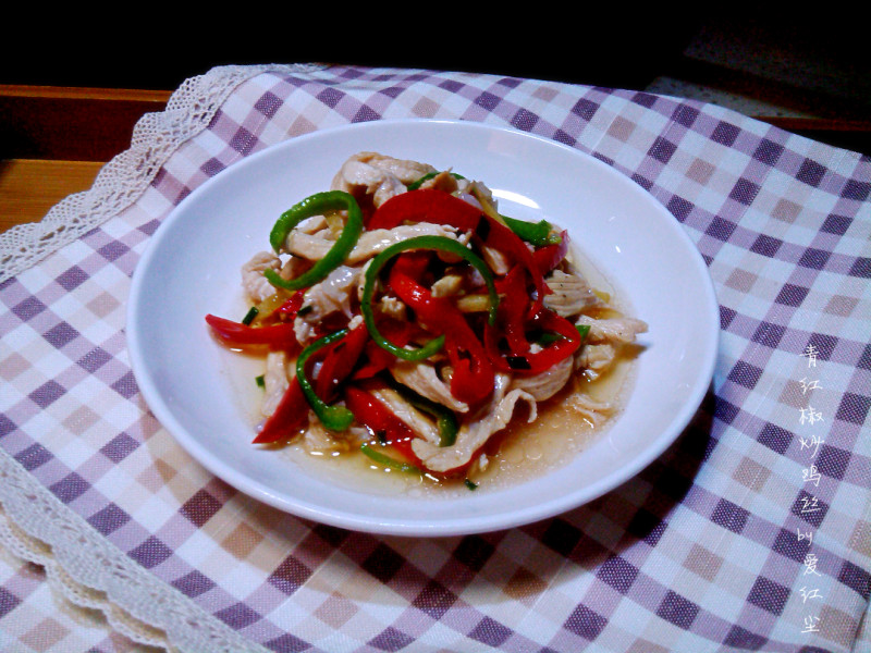 3:锅中留油,大火炒青椒丝至断生,然后放入炒好的鸡丝,放生抽,料酒,白糖炒匀。