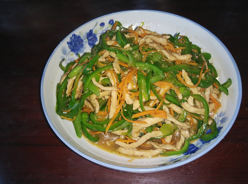 8:青椒变绿后,放入胡萝卜丝,沿锅边倒入调好的料汁,翻炒几下,即可出锅。