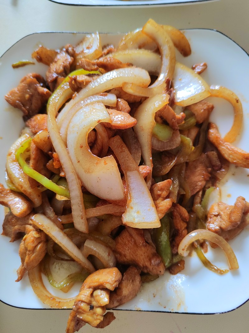 3:加入洋葱丝、青椒丝、2勺耗油、适量盐翻炒均匀盛出。