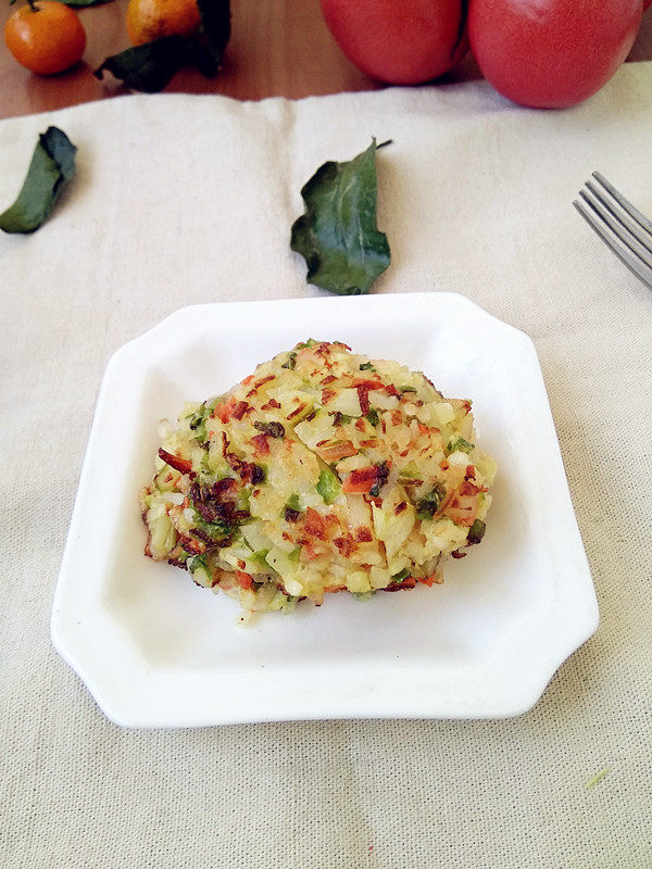 米饭100g;胡萝卜50g;土豆80g;青椒30g;白菜叶50g;鸡蛋60g;
