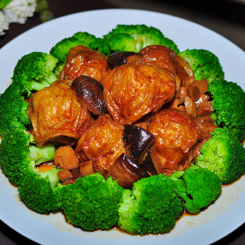 猪肉适量;油面筋适量;香菇适量;西兰花适量;