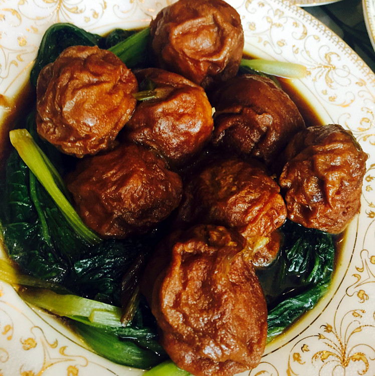 4:塞好的面筋与青菜一起放到锅里闷熟,中间加少量汤汁调味。