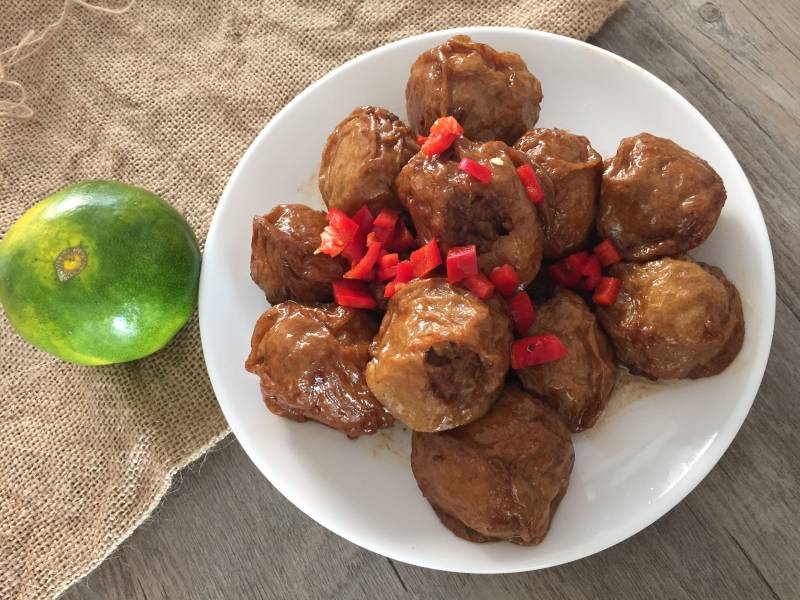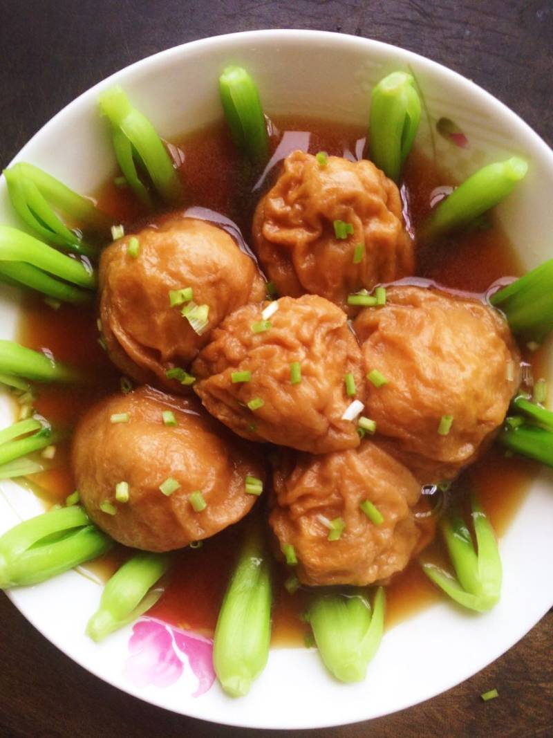 9:可根据个人喜好,撒上葱花或者红辣椒粒,筋道的油面筋里裹着猪肉末和藕粒,很入味。