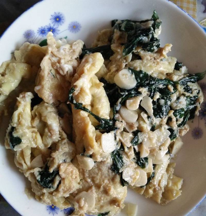 大蒜1个;红薯叶300g;鸡蛋5个;花椒6个;