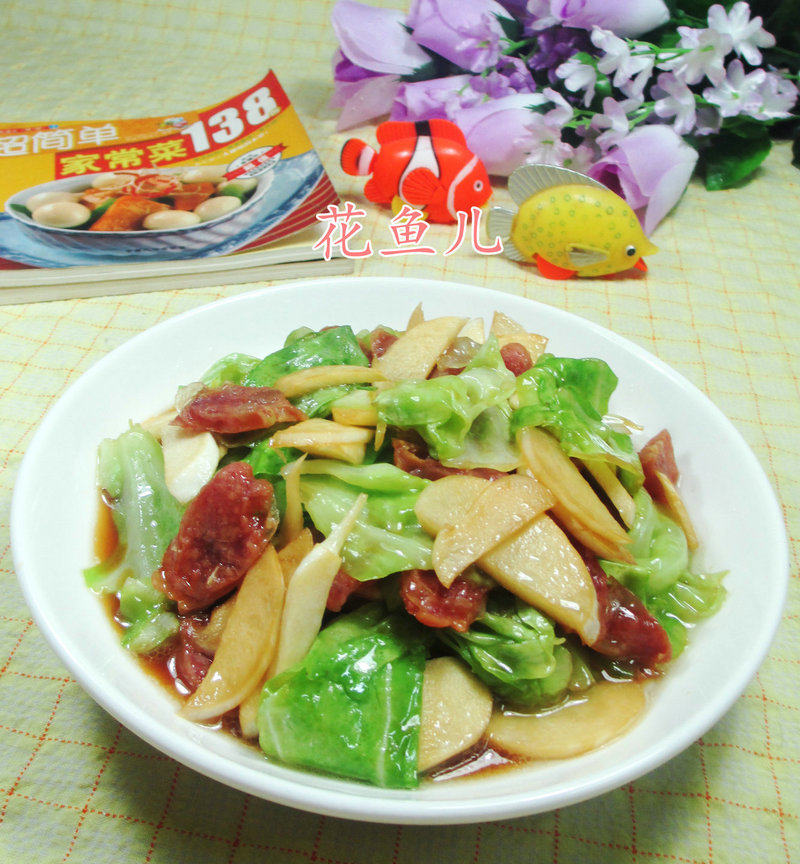 1:食材:香肠(已切片)、茭白(已剥壳清洗切片)、圆白菜(已清洗)