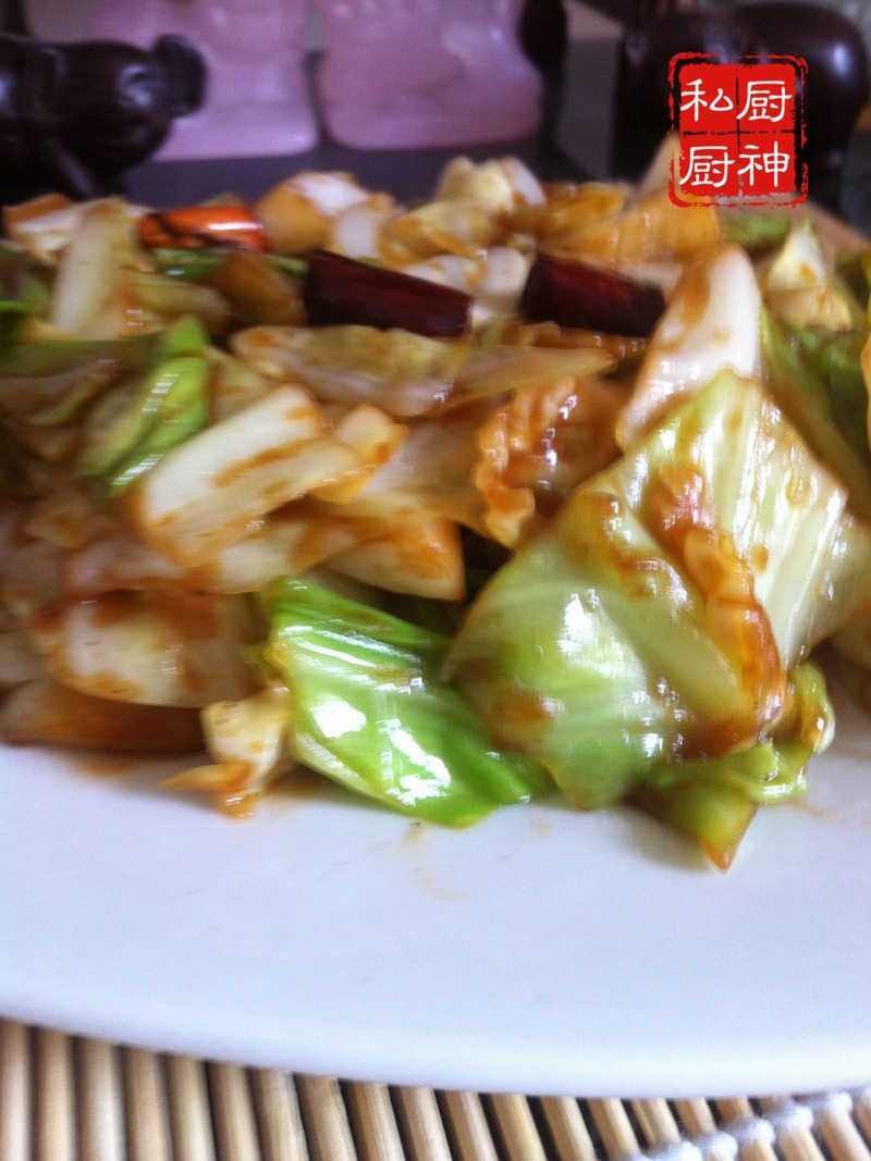 9:完成。第二次放入圆白菜的时候不宜在锅里时间过长。不然酱和汤就混在一起了,就没有酱爆的感觉了