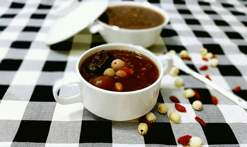 4:加入枸杞大枣和干桂圆继续小火熬煮至粥软糯即可