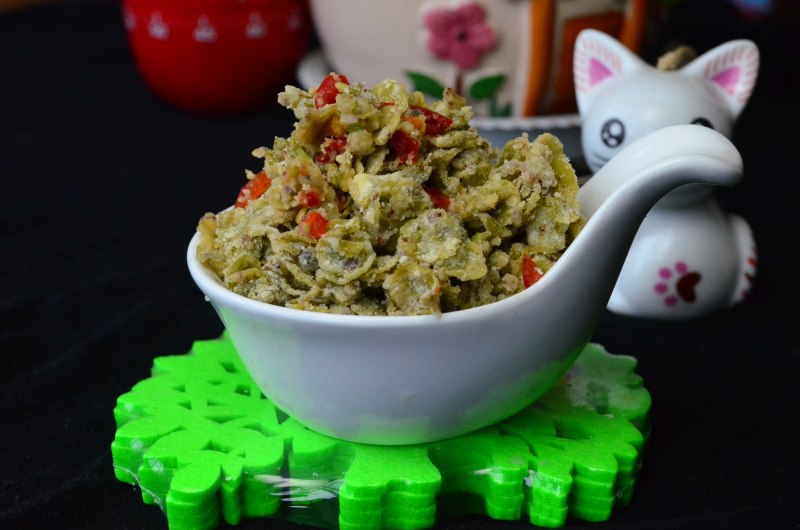 4:拌入面粉,需要确保每个叶子都拌上面粉;