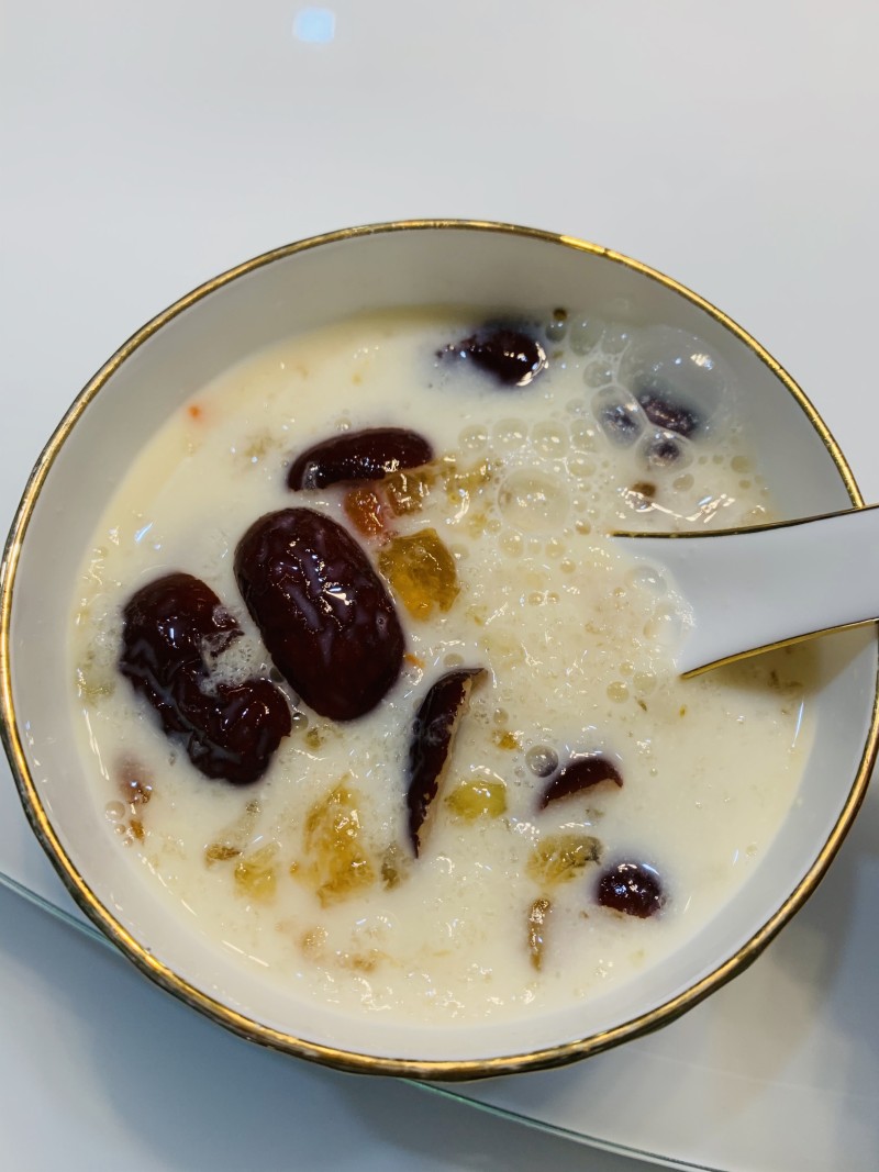 桃胶适量;红枣少许;枸杞少许;牛奶1杯;