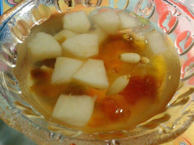 雪梨1个;桃胶10g;麦冬5g;蜂蜜适量;
