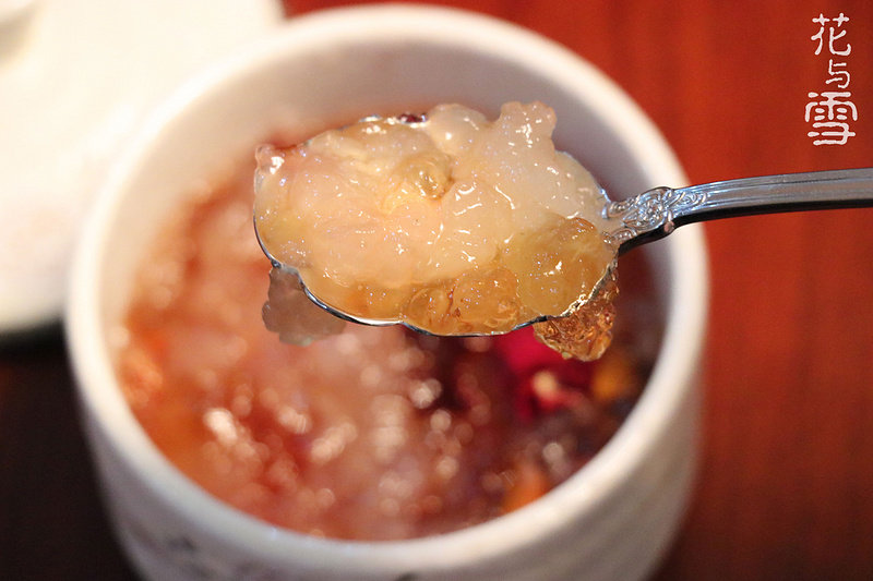 2:泡发后的桃胶用手一捏,非常软,泡发后的银耳取半朵