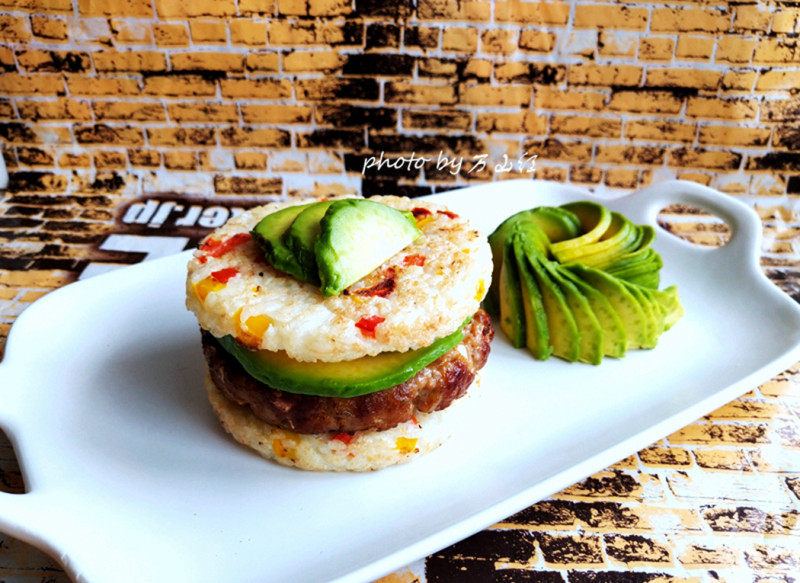 12:煎好后取出上下摆米饼,肉饼夹中间,可以弄点蔬菜配上。我是配了点牛油果。