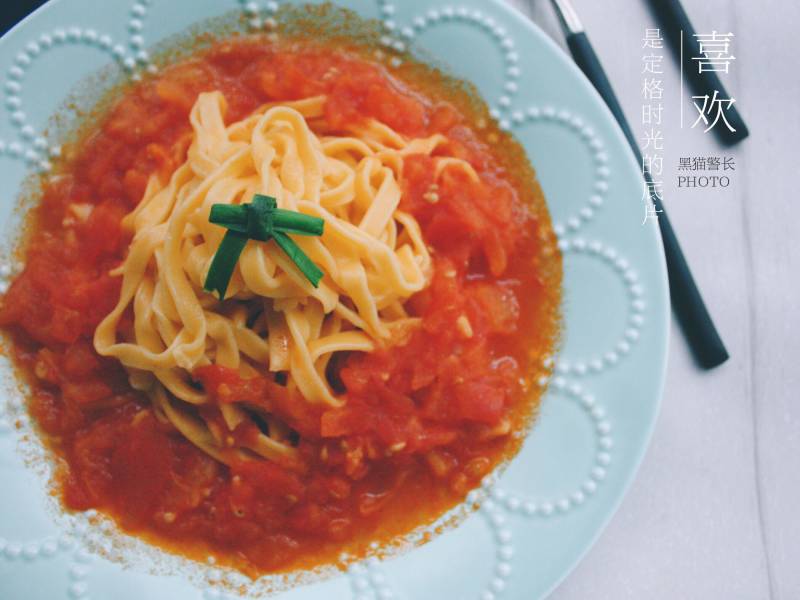 9:沥干水的南瓜面条铺上番茄浓汤,完成。