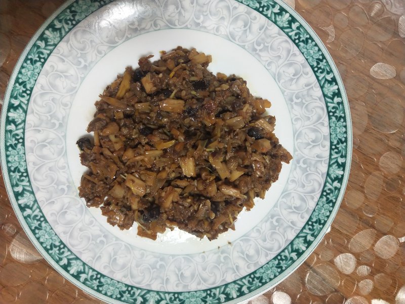 5:将切碎的黄花菜,蘑菇,花生碎放在一起,加入蚝油,盐,味精,搅拌均匀。
