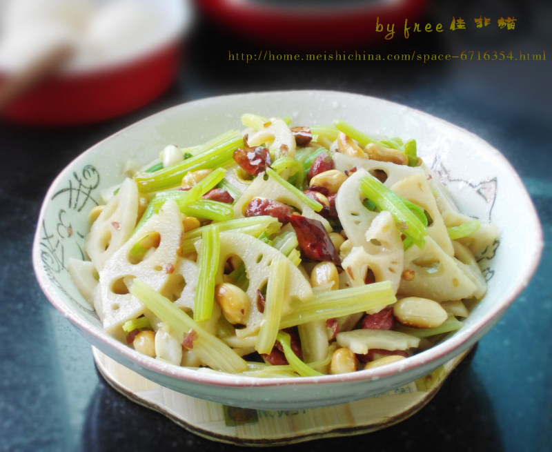 9:拌好的藕片加入花生米,倒入花椒油拌匀即可。