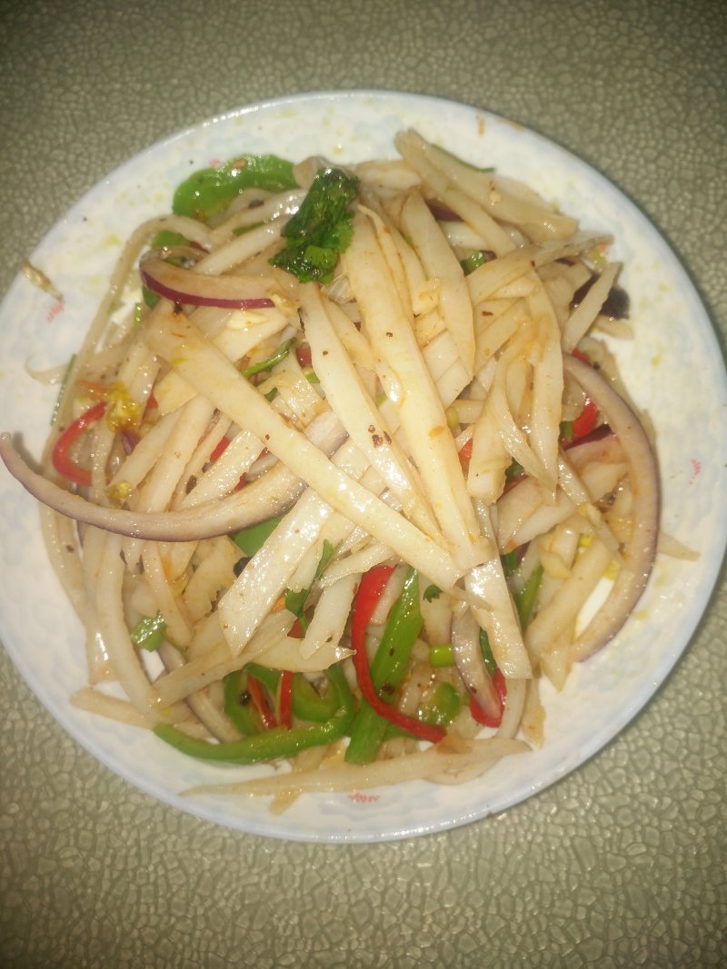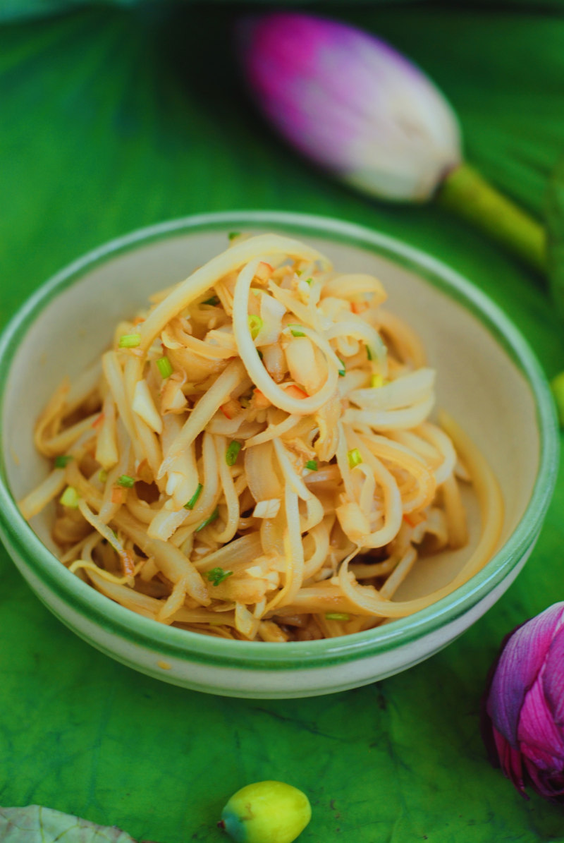 4:出香味后,将炝锅的大葱,干辣椒和油直接倒入藕丝中。放盐和糖。