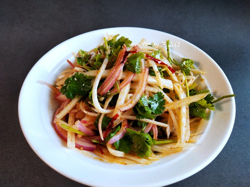 5:把藕丝放碗底,再放上洋葱丝和香菜段。到上热的炝辣椒,然后放入盐,糖,醋,生抽,藤椒油。