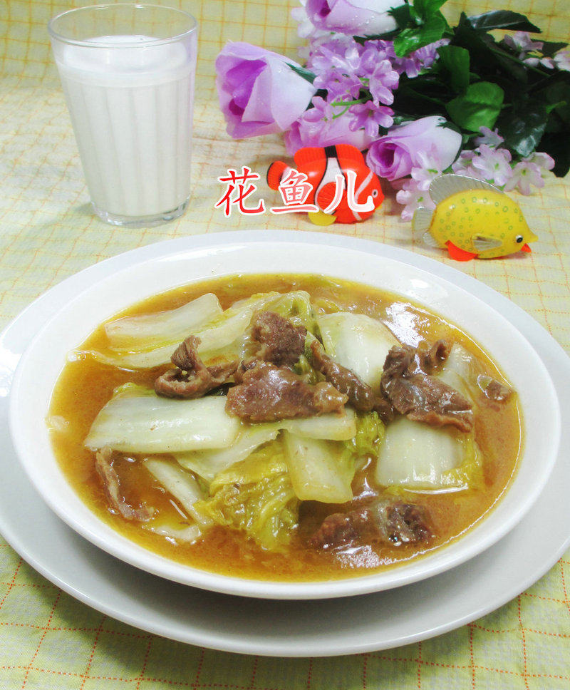 6:加入牛肉和汤一起炖煮小火慢慢炖让白菜入味