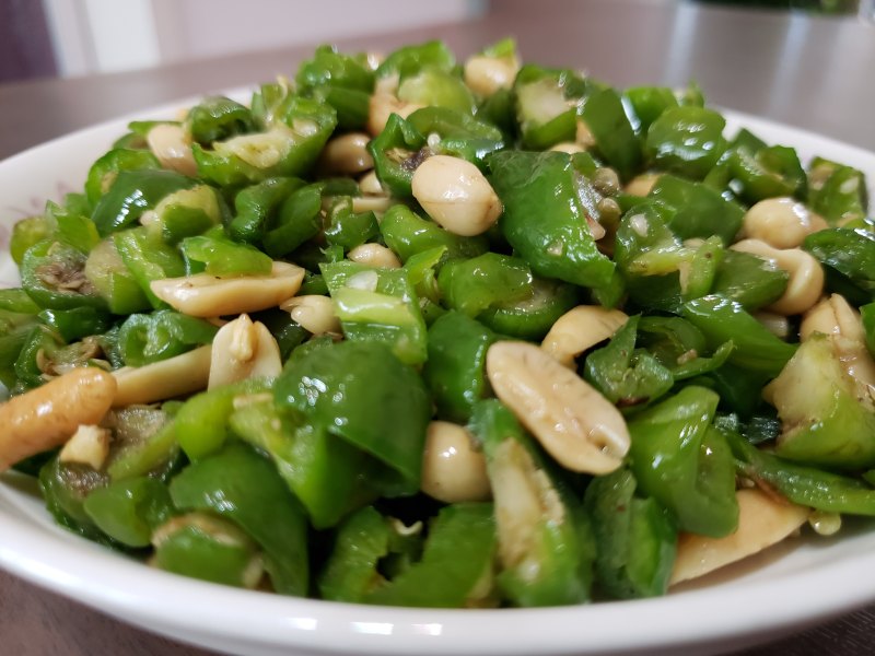 4:锅烧热放适量油,倒入尖椒煸炒,加适量盐调味,再倒入花生米,翻炒一下即可。