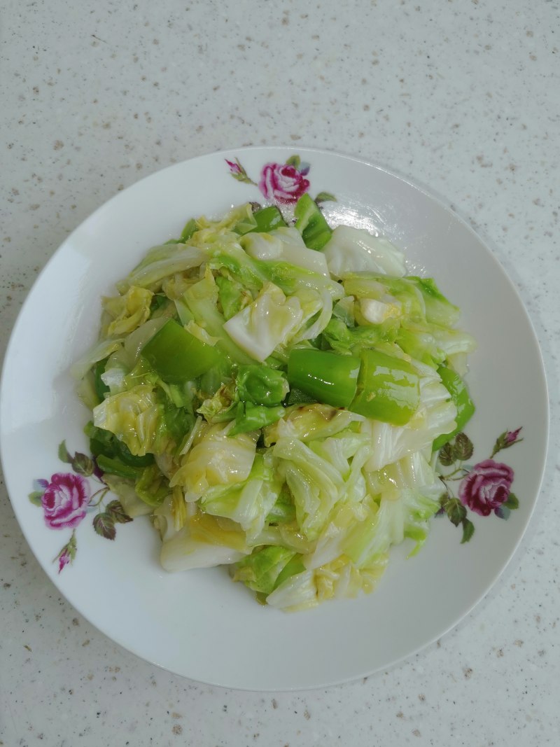 4:锅中放油炒青椒至断生,然后炒洋白菜至发蔫,撒盐味精炒匀即可。